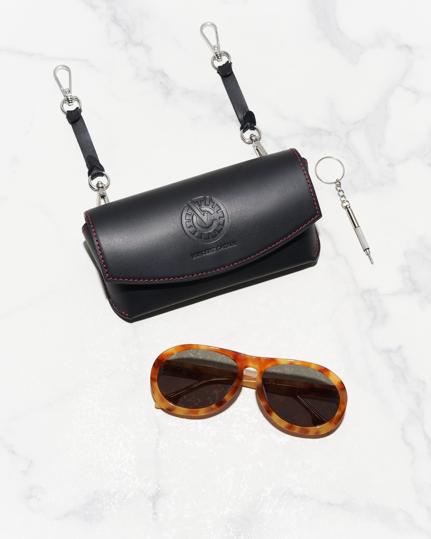 The glasses come with an ultra portable leather casing, a microfibre lens cloth and a keychain screwdriver, for adjustments and clarity on-the-go.